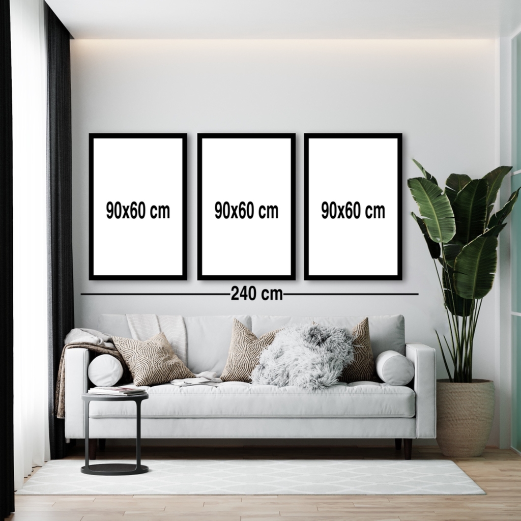 Para saber o tamanho ideal do conjunto de quadros para o seu ambiente é necessário ter a metragem da parede e do móvel, sofá ou cama que estejam próximos de onde será colocado os quadros. Logo abaixo na ilustração te orientamos para você ter uma noção de tamanho e proporção.