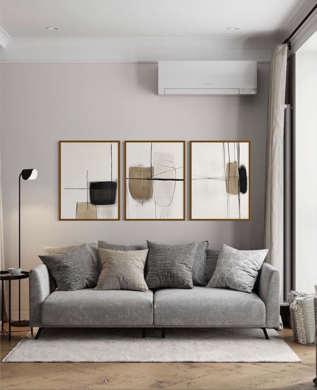Para saber o tamanho ideal do conjunto de quadros para o seu ambiente é necessário ter a metragem da parede e do móvel, sofá ou cama que estejam próximos de onde será colocado os quadros. Logo abaixo na ilustração te orientamos para você ter uma noção de tamanho e proporção.