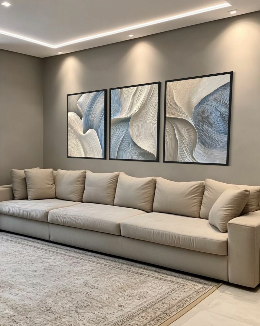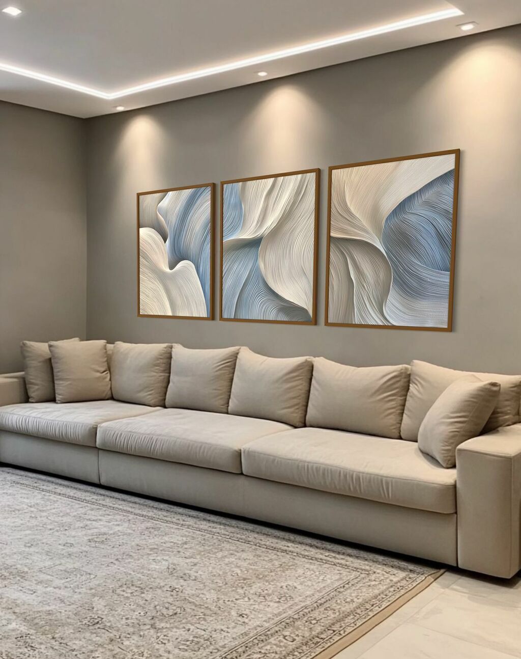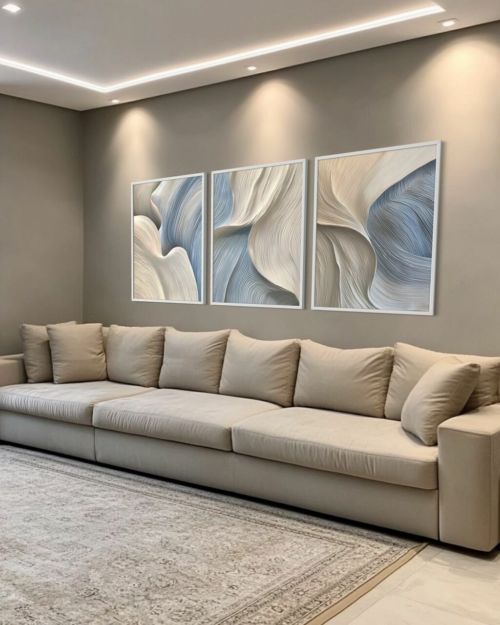 Para saber o tamanho ideal do conjunto de quadros para o seu ambiente é necessário ter a metragem da parede e do móvel, sofá ou cama que estejam próximos de onde será colocado os quadros. Logo abaixo na ilustração te orientamos para você ter uma noção de tamanho e proporção.