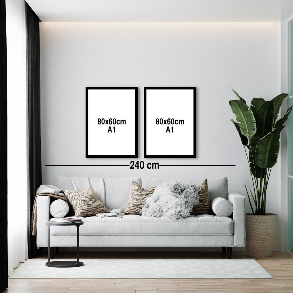 Para saber o tamanho ideal do conjunto de quadros para o seu ambiente é necessário ter a metragem da parede e do móvel, sofá ou cama que estejam próximos de onde será colocado os quadros. Logo abaixo na ilustração te orientamos para você ter uma noção de tamanho e proporção.