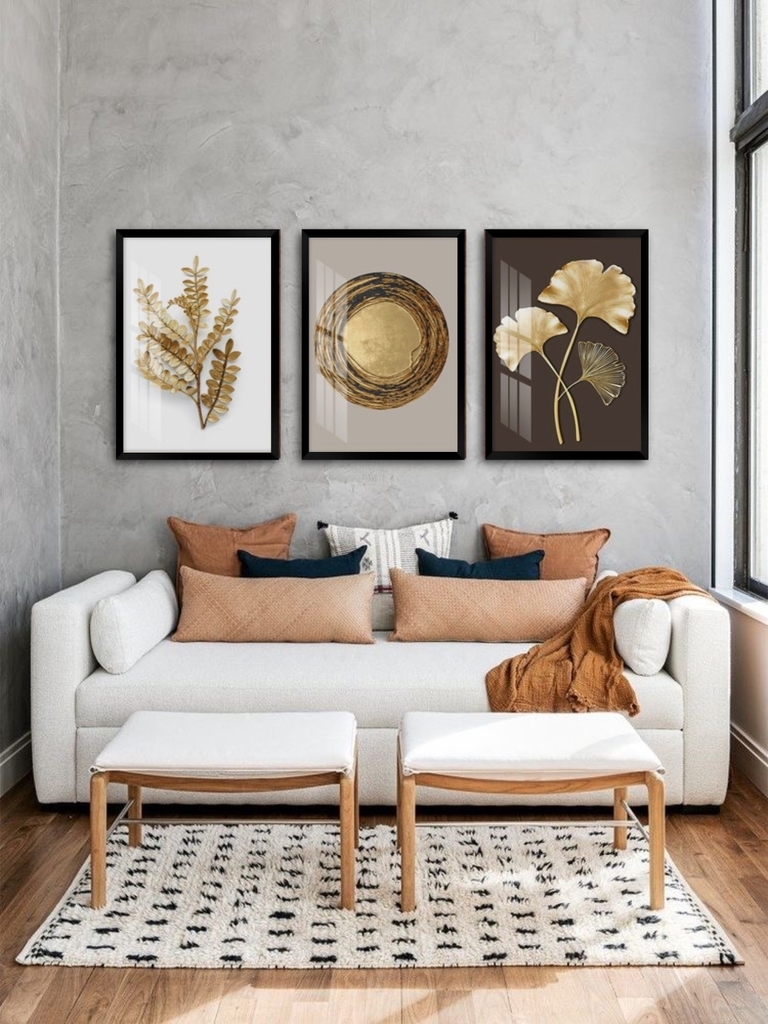 Para saber o tamanho ideal do conjunto de quadros para o seu ambiente é necessário ter a metragem da parede e do móvel, sofá ou cama que estejam próximos de onde será colocado os quadros. Logo abaixo na ilustração te orientamos para você ter uma noção de tamanho e proporção.
