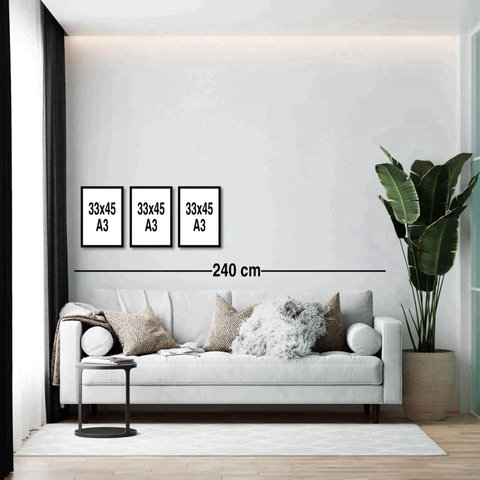 Para saber o tamanho ideal do conjunto de quadros para o seu ambiente é necessário ter a metragem da parede e do móvel, sofá ou cama que estejam próximos de onde será colocado os quadros. Logo abaixo na ilustração te orientamos para você ter uma noção de tamanho e proporção.