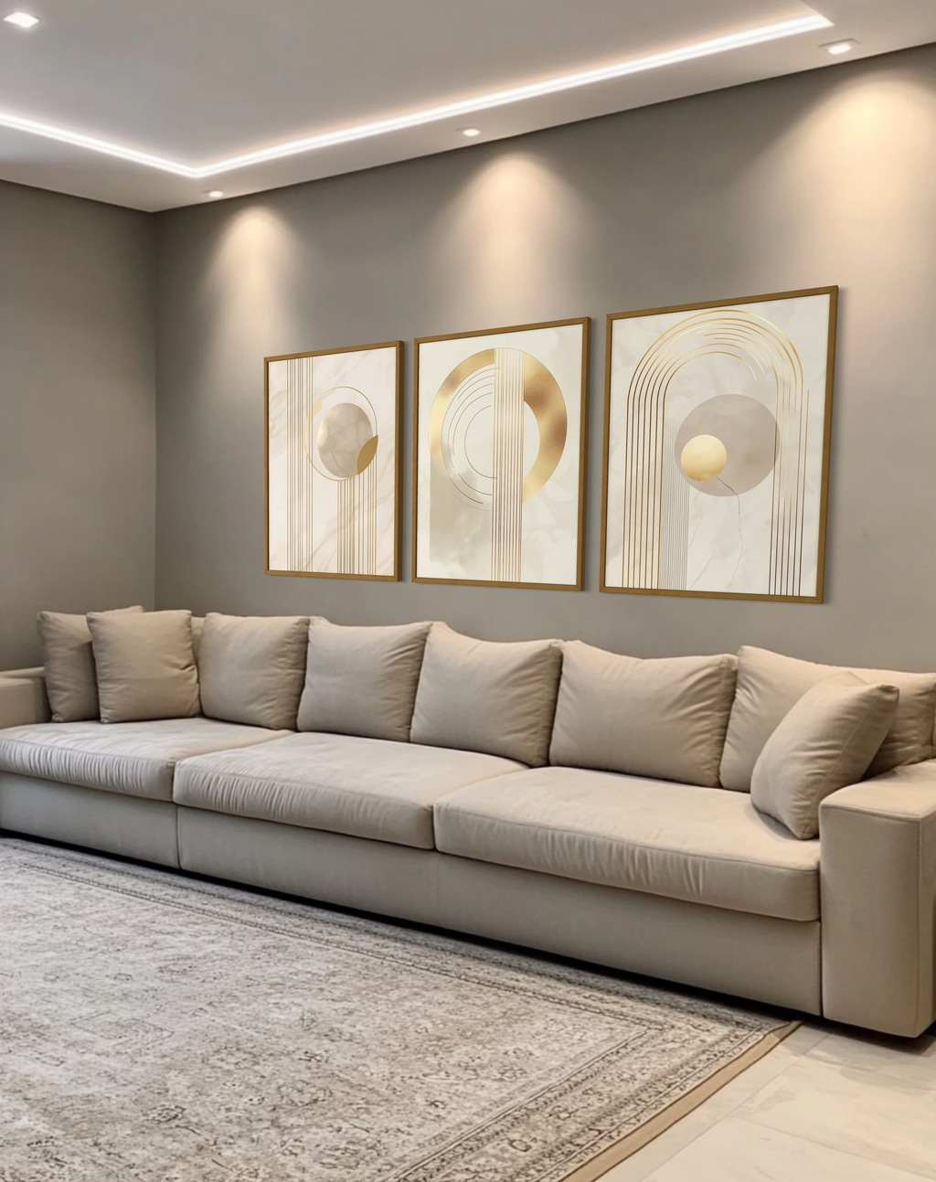 Para saber o tamanho ideal do conjunto de quadros para o seu ambiente é necessário ter a metragem da parede e do móvel, sofá ou cama que estejam próximos de onde será colocado os quadros. Logo abaixo na ilustração te orientamos para você ter uma noção de tamanho e proporção.